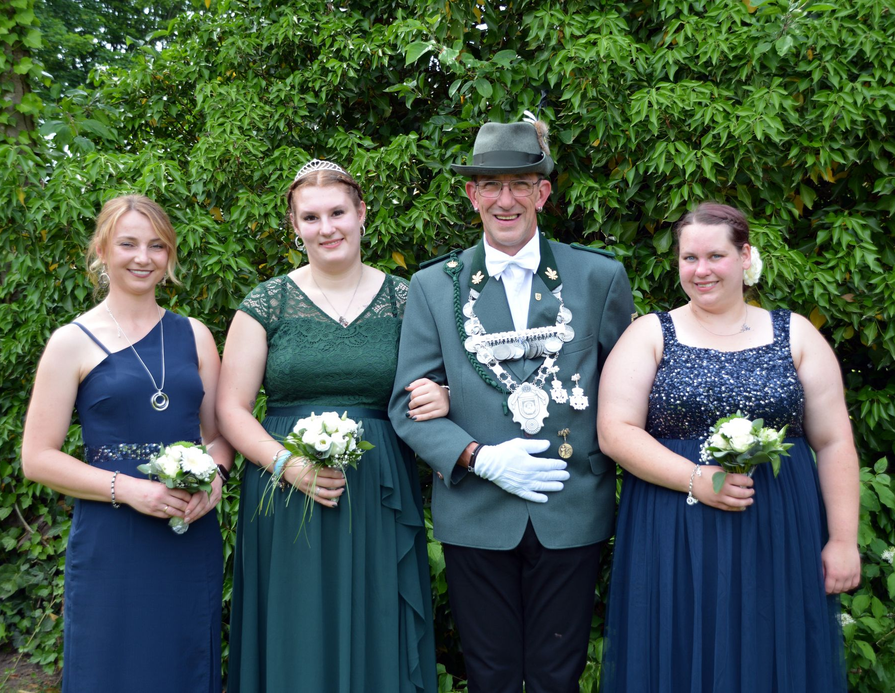 Unser Königsthron 2025 mit Schützenkönig Jürgen Sterzenbach und Königin Jule Sterzenbach. Zur Seite stehen ihnen die Ehrendamen Ella Siedlecka (links) und Gianna Patthoff (rechts).