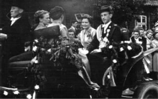 1953, 2. Tag und 1956/57: König Ernst Bavendiek, Königin Magdalene Bavendiek, Ehrendamen Maria Siemers und Maria Nölker.